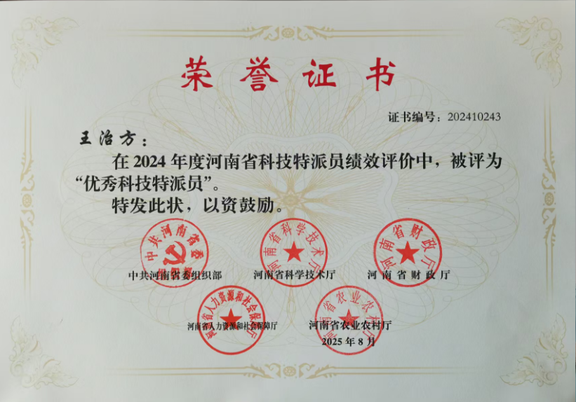 近日,中共河南省委组织部、河南省科学技术厅、河南省财政厅、河南省人力资源和社会保障厅、河南省农业农村厅联合下发《关于公布2024年度河南省科技特派员绩效评价结果的通知》,我所王治方科技特派员被评选为“优秀科技特派员”。
