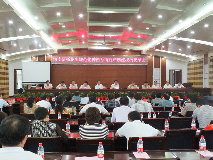 2012年9月11日,河南省农业厅、河南省农科院与驻马店市政府联合在全国第一花生大县——正阳,组织召开了 “河南夏播花生规范化种植万亩高产创建”现场观摩会。省农业厅副厅长魏蒙关,我院副院长张新友、房卫平,省经济作物推广站站长赵永谦,驻马店市政府副市长戚存杰,副秘书长黄卫华,驻马店市农科院院长杨清岭、副院长余飞,我院推广处、科研处、经作所的领导和专家,驻马店市、南阳市、信阳市及所辖县(县、区)的农业主管部门、农技推广部门及种子企业代表等150余人参加了现场观摩会。会议由推广处田云峰处长主持。